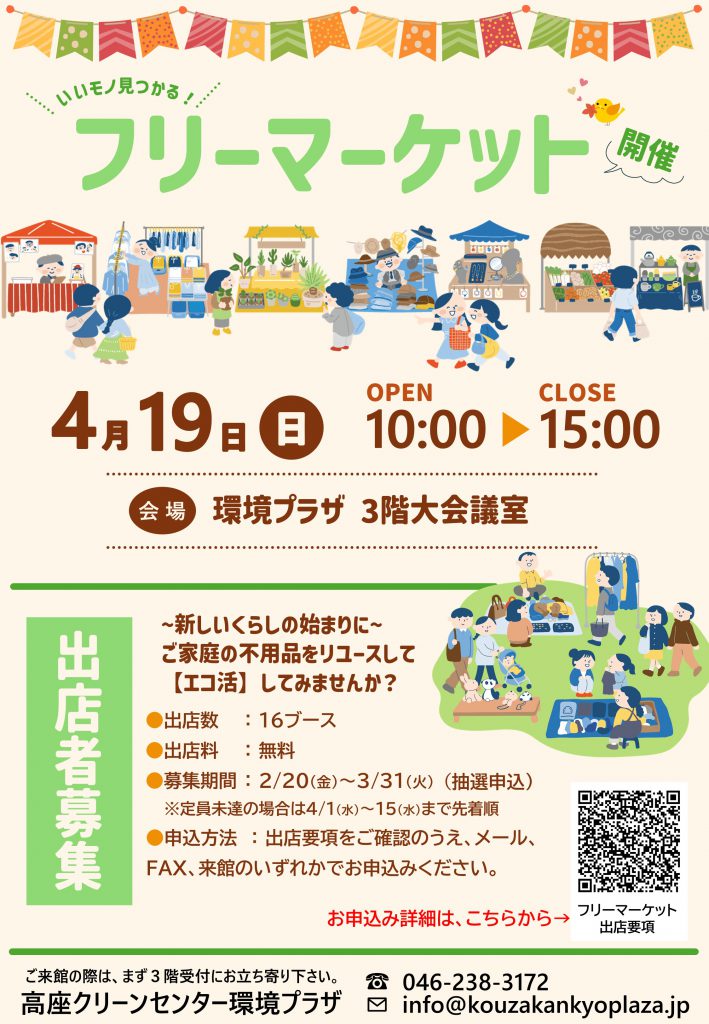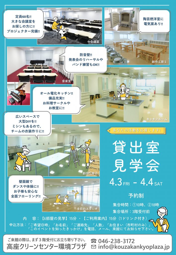 2026年 4月イベント情報 まとめ 新着情報・イベント2026.03.08 2026年4月イベント情報 (2026.3.8時点)●3日(金)&4日(土) 貸出室見学会貸出室見学会案内PDF ●4日(土) フラワーアレンジメントフラワーアレンジメント案内PDF●19日(日) フリーマーケットフリ-マーケット案内PDF●23日(木) はじめてのピラティス教室はじめてのピラティス教室案内PDF « 前の記事へ
